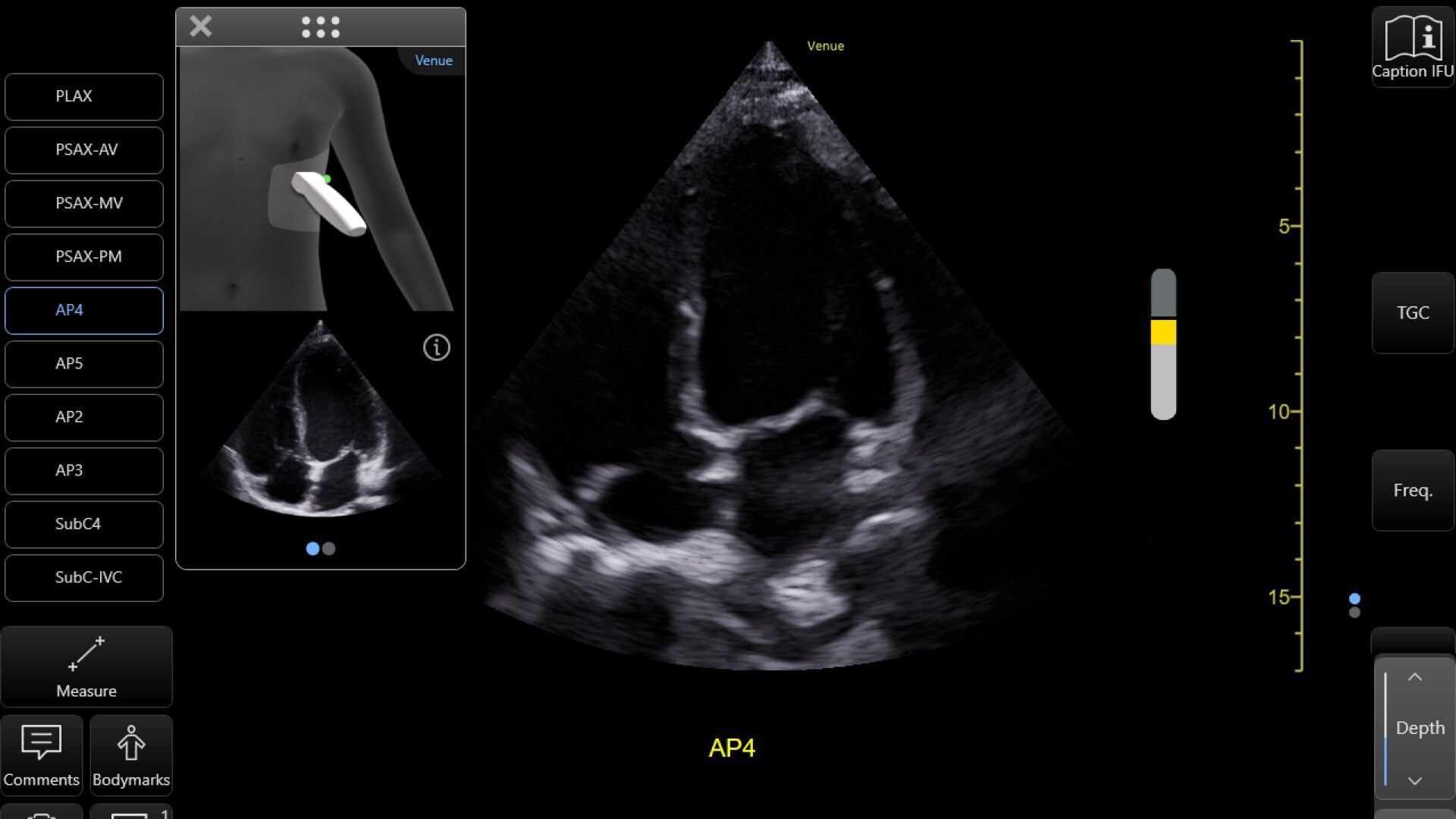 Preliminary probe placement information shows you where to place and how to orient the ultrasound probe. As you begin the exam, a handy reference image shows you the image you are trying to acquire.